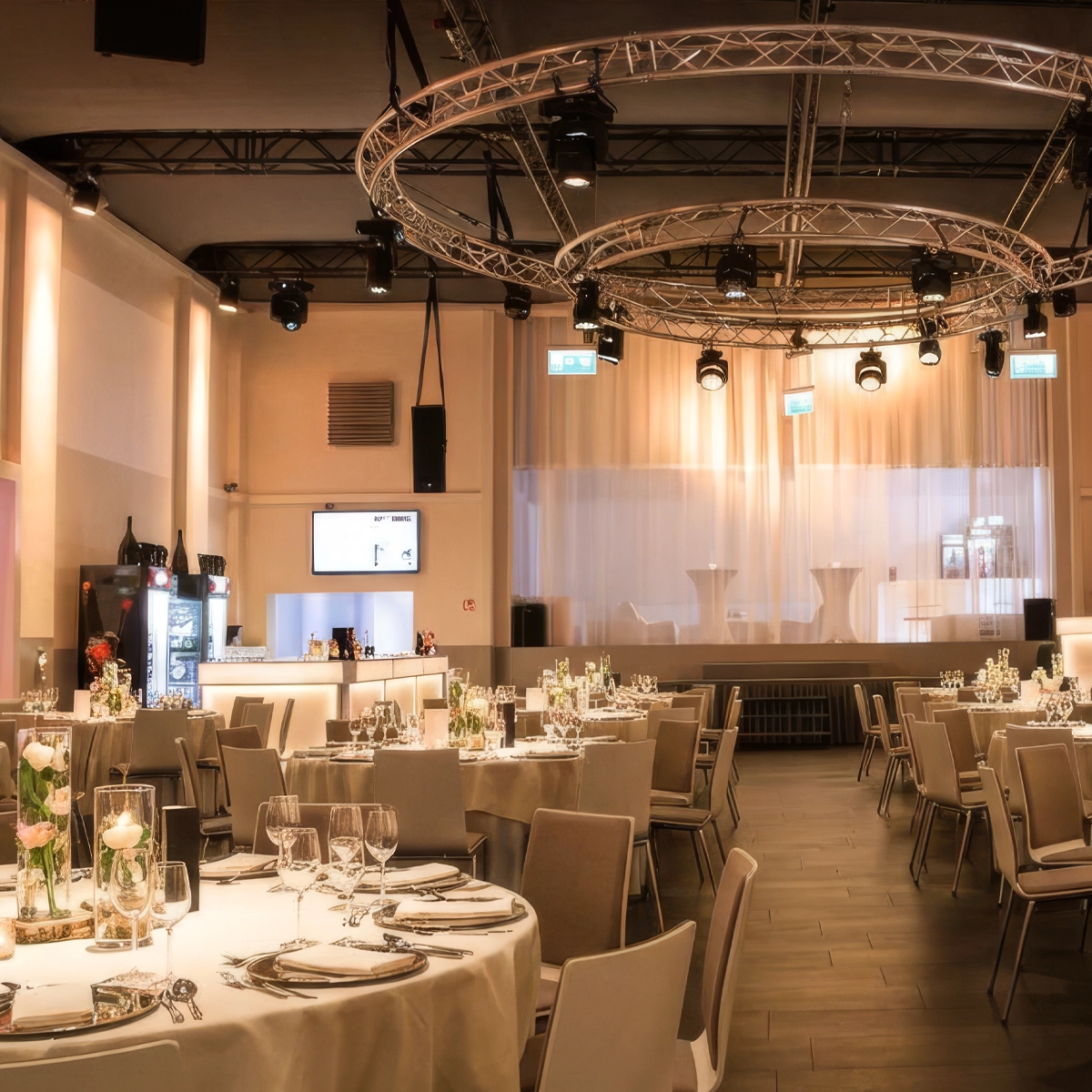 Damit Ihr Eröffnungstanz oder die emotionale Rede des Brautvaters perfekt zur Geltung kommen, stellen wir Ihnen unsere gesamte High-End-Infrastruktur zur Verfügung. Unsere fest verbaute Bühne und die sechs Videobeamer erlauben es Ihnen, persönliche Videos oder Fotos großflächig zu präsentieren, ohne zusätzliche Technik anmieten zu müssen. Das moderne Lichtsystem taucht den Raum exakt in Ihre Hochzeitsfarben. Ein entscheidender Vorteil: Im KW Eventcenter gibt es keine frühe Sperrstunde – Sie und Ihre Gäste können die Nacht zum Tag machen und ohne Zeitdruck feiern.